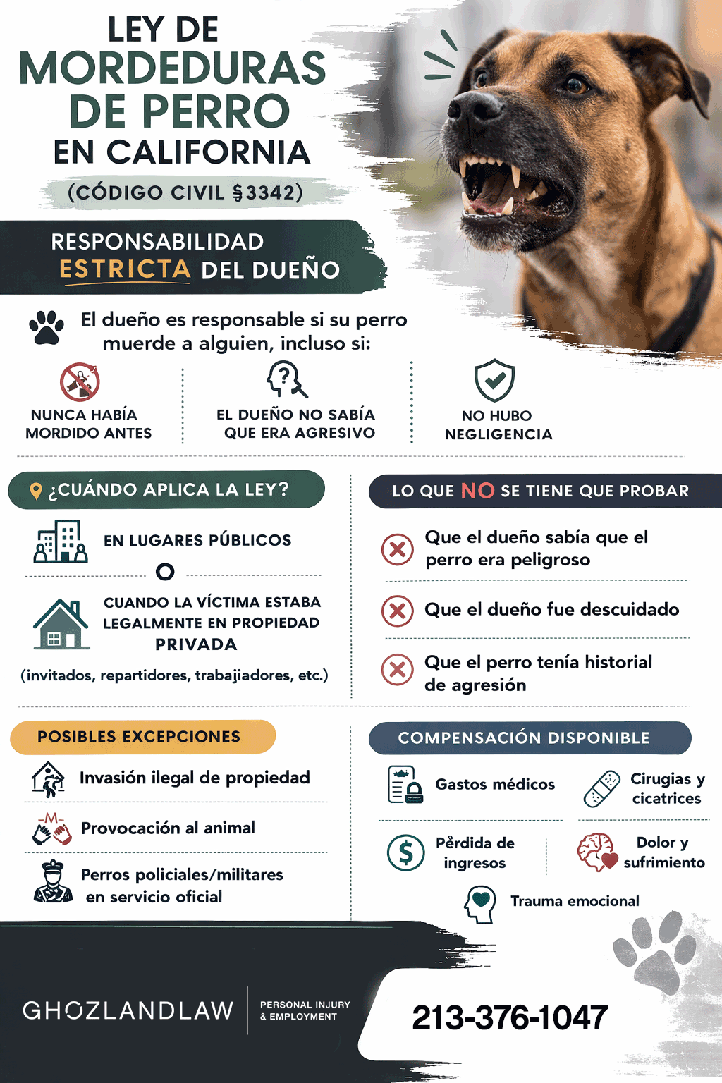 Bajo el Código Civil de California §3342, el dueño del perro es automáticamente responsable si su perro muerde a alguien. No importa si el perro no tenía antecedentes de agresividad. La ley aplica tanto si la mordedura ocurre en un lugar público como en una propiedad privada donde la persona lesionada se encontraba legalmente.